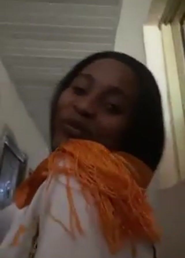 Two women stand in a narrow hallway with a low ceiling and a strip light. The woman closest to the camera has dark hair, a white top, and an orange scarf. She is talking and gesturing with her hands. The other woman has dark hair and a black top. Several framed pictures hang on the wall behind them.