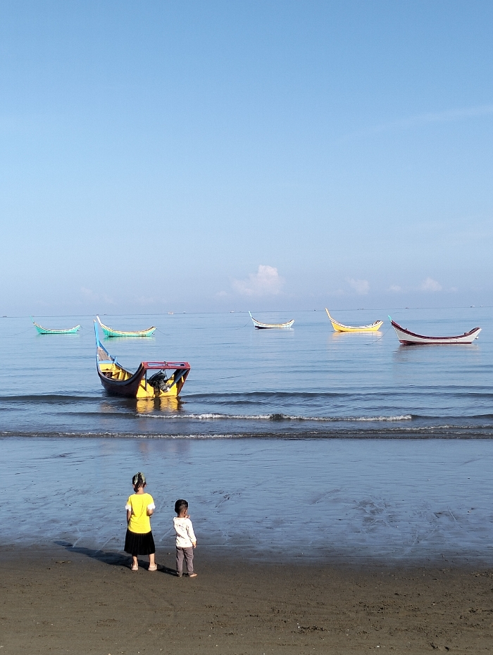 - "Two young children stand on a sandy beach, gazing at a tranquil sea dotted with several colorful boats" by FM-sAcf03, licensed under CC BY 4.0