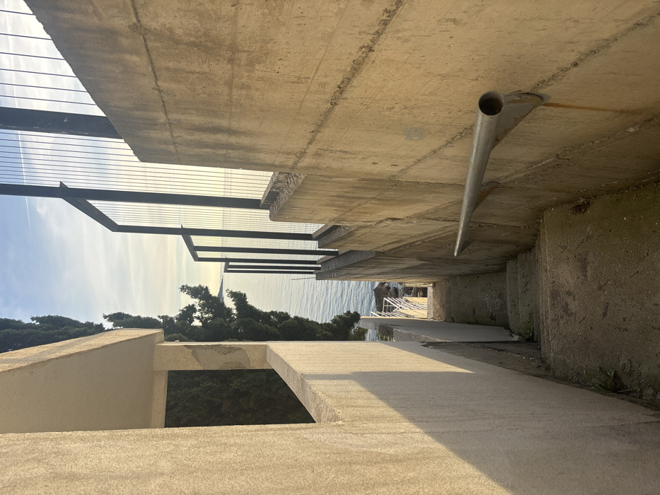 The image displays a concrete staircase descending towards the sea in Kruče - Kërruçi, Montenegro. The narrow stairwell is enclosed by two distinct structures. On the left, a light-colored, possibly stucco-finished building wall features a rectangular opening, likely a window or balcony. On the right, a rough, unpainted concrete retaining wall, showing visible formwork impressions and some discoloration, runs parallel to the descent. A single, cylindrical metal handrail is affixed to this right concrete wall. The concrete steps appear worn, with minor vegetation visible in some crevices. Further down the descent, at what appears to be sea level, white metal railings are visible, indicating an access point to the water. Above the right concrete wall, a dark metal fence with vertical bars is visible, separating the path from the open expanse of the sea. Beyond the structures, calm, blue-green sea water extends to the horizon under a clear, light blue sky with a faint, linear contrail. Tall, dark green trees are present on the left side, positioned between the building and the coastline. No individuals, animals, or active interactions are depicted. Natural sunlight illuminates the scene, casting elongated shadows.