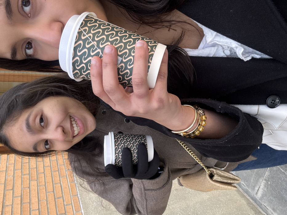 Two individuals are captured in a medium close-up shot outdoors in Las Rozas de Madrid, Spain. The subject on the left, a female with dark hair, smiles directly at the camera while holding a small disposable coffee cup in her gloved left hand. She wears a brown/taupe coat with prominent circular buttons and dark blue jeans. A small, gold-colored cross-body bag with a chain strap hangs from her left shoulder. The subject on the right, also female, is partially visible, with her face cropped above the nose. She is actively drinking from a larger, identical disposable coffee cup. Her right hand, adorned with gold-colored bracelets (one solid, one beaded with amber/yellow stones), holds the cup. She wears a black coat over a white, ruffled top, and a thin gold-colored chain with a small cross pendant is visible around her neck. Both coffee cups are white with dark green sleeves featuring a repeating pattern of light beige wavy lines and white plastic lids. The background consists of a light brown brick wall on the left and a darker, indistinct building material on the right. The ground in the lower portion of the image appears to be a light-colored paved surface. Natural daylight illuminates the scene.