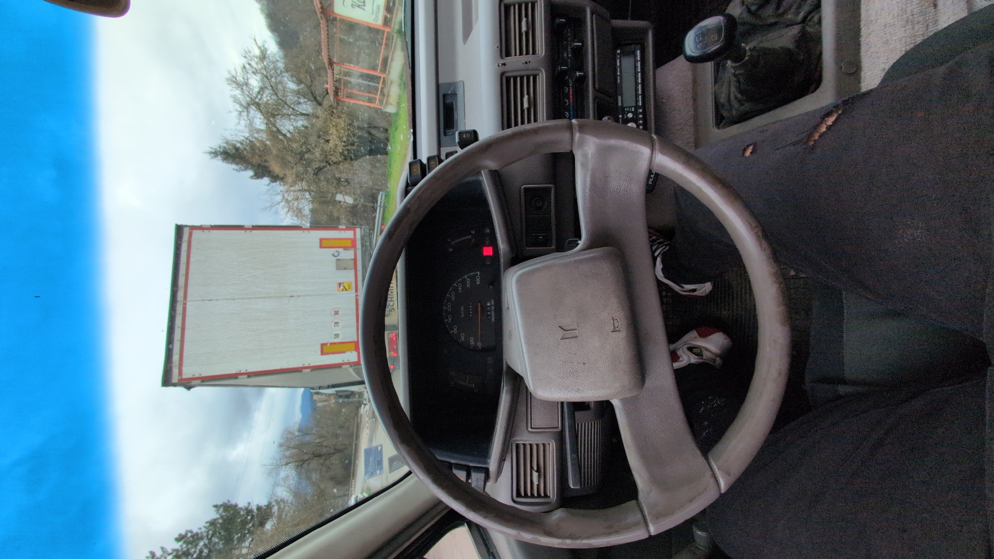 interior of a vehicle, focusing on the dashboard and steering wheel. The steering wheel features an Isuzu logo, indicating the vehicle's brand. The dashboard is visible, including the instrument cluster with gauges. Outside the windshield, a truck with white panels is visible, alongside trees, and a structure that appears to be at the entrance of the city of Troyan, Bulgaria. The overall environment seems to be outdoors, likely during daylight hours. The seat beside the steering wheel is occupied by an individual whose clothing is visible. There is a shoe near the footwell.