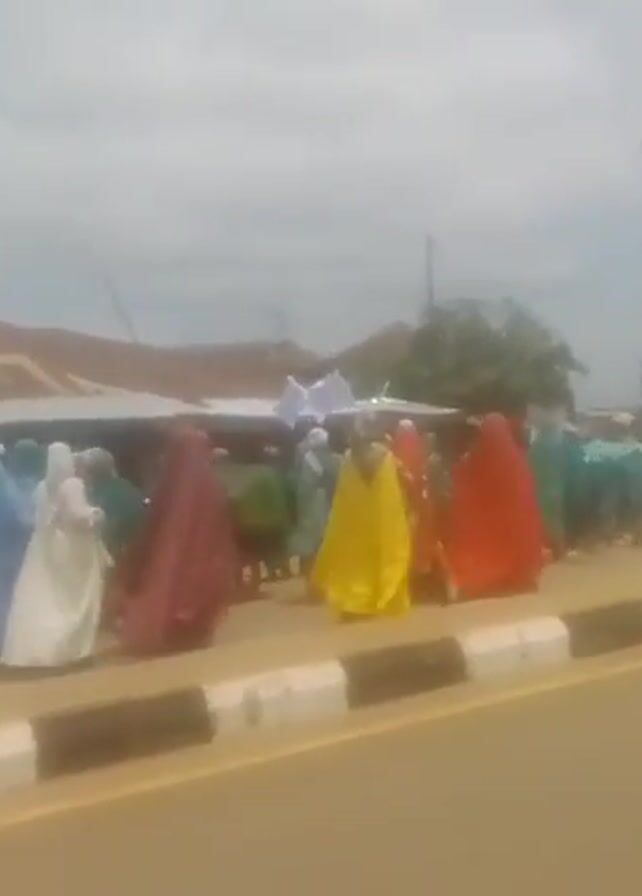 A large group of people is walking along the side of a road, next to a curb. Many people are wearing green garments. Some are wearing other colors, including yellow, red, white, purple, and pink. Most appear to be carrying flags, mostly white and green. Buildings and power poles are visible in the background. A few motorcycles pass by. The sky is overcast.