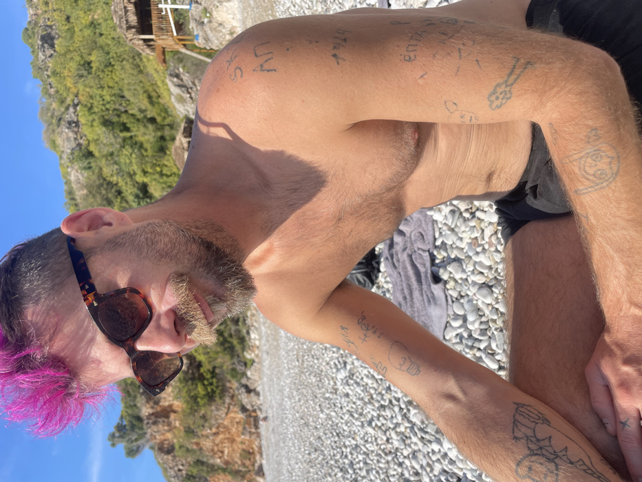 A male individual is observed sitting on a pebbled beach in Drobnići, Montenegro, under a clear blue sky. He possesses bright pink, spiky hair and wears tortoiseshell-patterned sunglasses. A light brown beard and mustache are present on his face. He is bare-chested, revealing sun-tanned skin and numerous small, rudimentary, line-art tattoos on both arms and shoulders, including symbols, text, and figures. He is wearing black swim trunks. His hands are partially visible, resting in his lap. Behind him, on the pebbles, a dark-colored towel is partially visible. The background features steep, rocky cliffs heavily covered with green vegetation. To the right, a rustic structure with a thatched roof and wooden supports is visible, consistent with a beach hut or bar. Bright sunlight casts shadows on the man's body.
