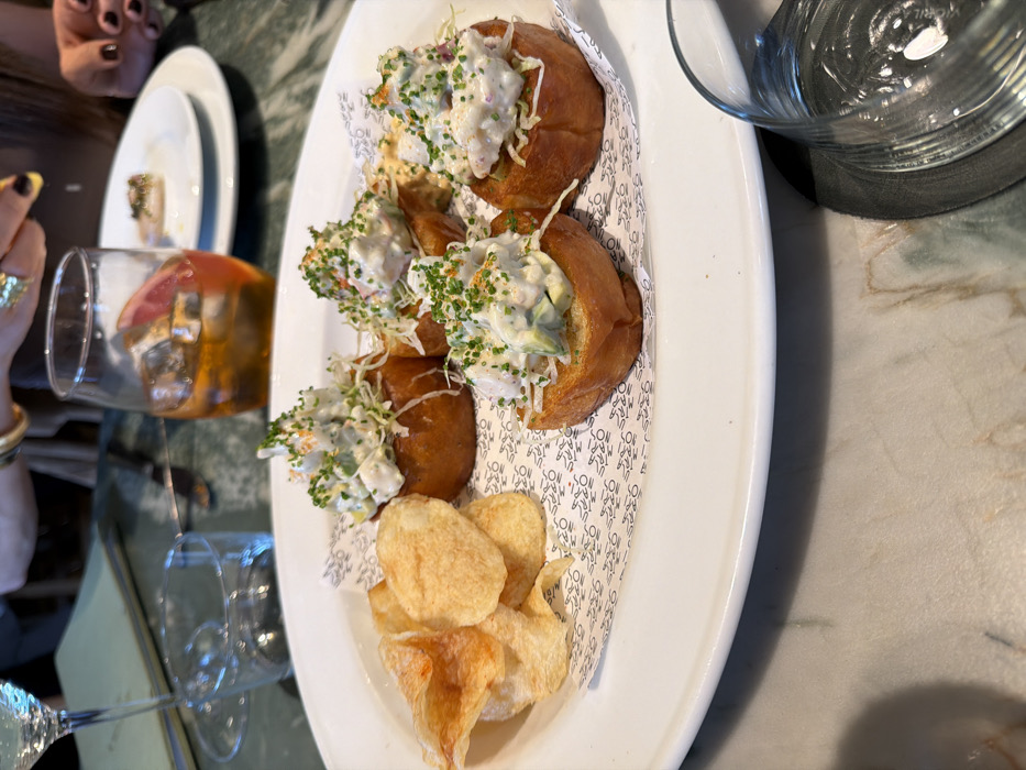 A white plate holds four mini lobster rolls and a small pile of potato chips. The rolls are topped with a creamy salad, garnished with green herbs. Printed paper lines the plate beneath the food. A glass of liquid with ice sits to the left, next to an empty wine glass. A full glass of water is positioned on the upper right of the plate, resting on a dark gray coaster. The background features a marble-like surface.
