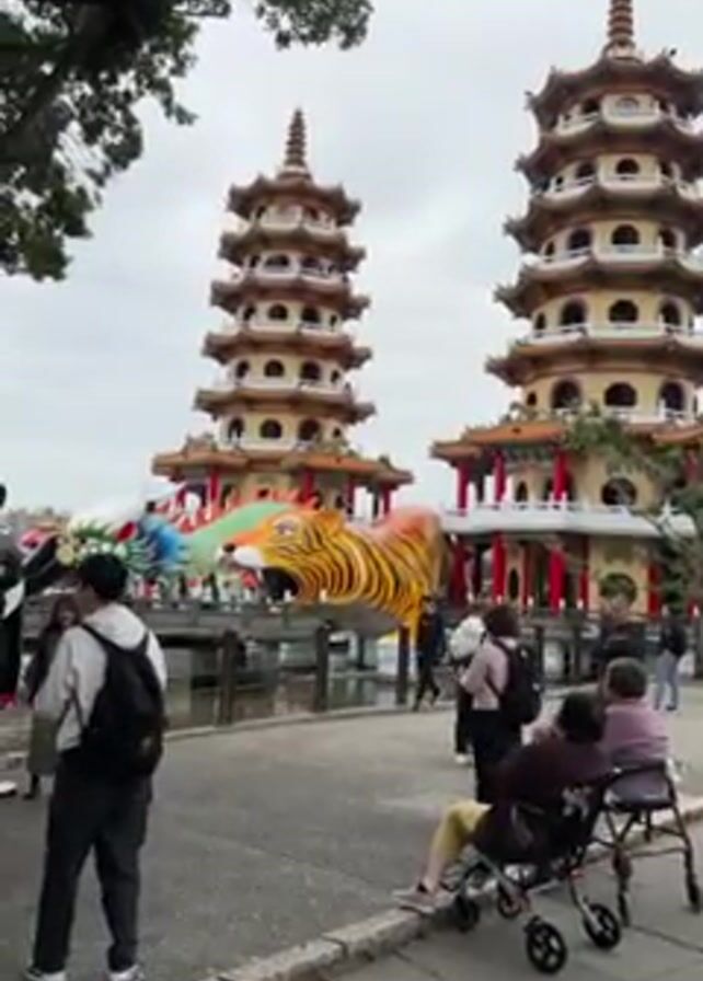Dragon and Tiger Pagodas in Kaohsiung, Taiwan. Two tall pagodas stand on either side of a waterway, which is adorned with large, colorful sculptures of a dragon, a tiger, and a panda. People are walking around and taking pictures. The weather appears overcast. There are trees in the foreground, one with long hanging roots. Some people are sitting on benches and in wheelchairs.