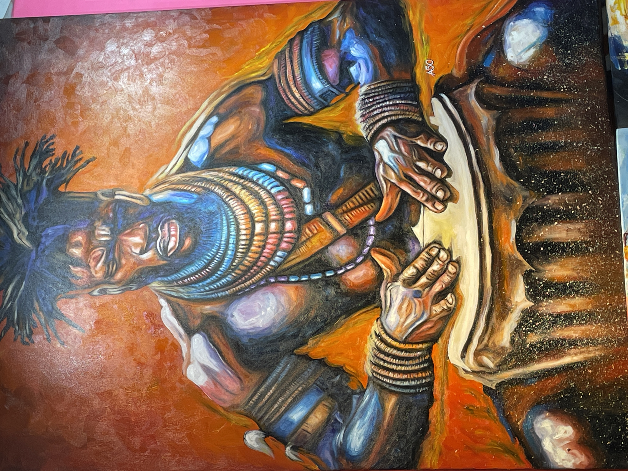 An oil painting depicts a man with dark skin and dreadlocks playing a drum. He has colorful beaded necklaces and wristbands. The background is an orange-brown color. The signature "ASO" is visible in the top right corner of the painting. The painting could potentially depict a man in Zanzibar, Tanzania, given the style and subject matter. There are no specific details in the painting to confirm its exact location within Zanzibar or Tanzania.
