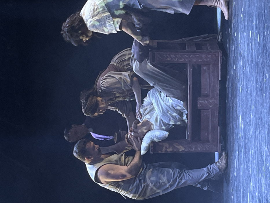 This image depicts a theatrical performance unfolding on a dimly lit stage in a theater located in Novoshakhtinsk, Russia. Five individuals are present on the stage. The central figure is a male, lying supine on a dark reddish-brown, ornately carved wooden bench or bed, his head resting on a white pillow. He is dressed in a light-colored, long-sleeved shirt and light trousers. To the left, a muscular male wearing a light-colored sleeveless tunic and patterned trousers stands, his hands placed firmly on the head of the reclining figure, appearing to support or console him. To the immediate right of the reclining figure, a female, dressed in a dark vest over a light blouse and a patterned skirt with a head covering, leans over, her right hand resting on the reclining figure's chest. Further to the right, a second female in a light-colored dress is positioned near the reclining figure's legs, her hands interacting with his lower left leg. In the background, a partially obscured male figure stands, observing the scene, and appears to be holding a small, dark object in his left hand. The stage floor is dark with a subtle blueish tint, and the background is black, indicating a focused spotlight on the performers. The collective actions suggest a scene of distress, care, or a significant dramatic event centered on the reclining individual.
