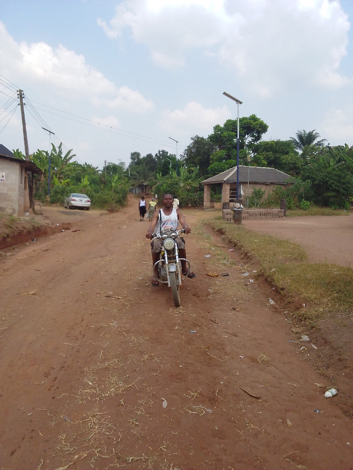 A man rides a motorcycle on a dirt road in a rural area. The road is reddish-brown and covered with debris. A building with a covered area stands to the right. Power lines run overhead, and a silver car is parked on the left side of the road. Other people are walking in the distance. The sky is blue with scattered clouds, and trees and bushes are visible in the background.