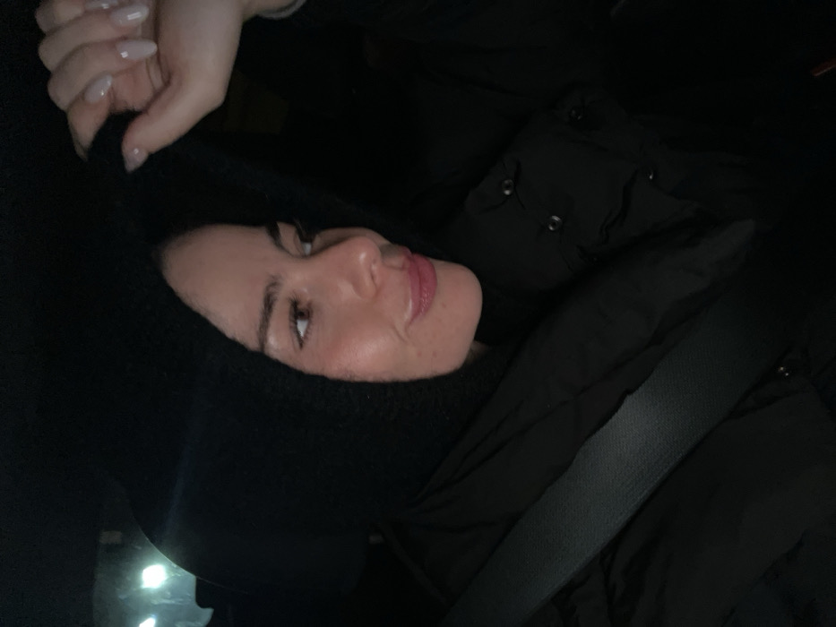 A woman with fair skin and pink lips looks slightly upward, her gaze soft. She wears a black knit balaclava around her face. A hand with long, manicured nails holds the edge of the balaclava. The woman is wearing a black puffy jacket with visible buttons and a seatbelt diagonally crossing her torso. The overall scene is dimly lit, appearing to be inside a car at night.