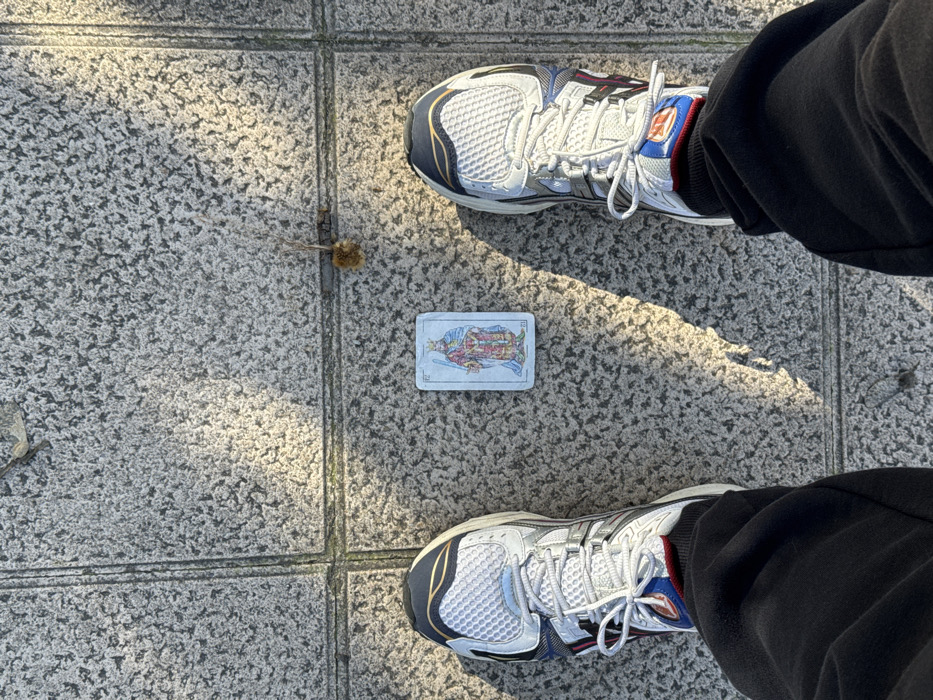 An overhead photograph depicts the lower extremities of an individual standing on grey, textured paving stones in L'hospitalet De Llobregat, Spain. The individual wears black athletic pants and white, blue, and black athletic shoes with white laces. Centered on the pavement between their feet is a single playing card, approximately 5x8 cm, featuring a colored illustration of a crowned figure holding a sword; the number "22" is visible on the card's upper left corner. To the right of the card, a small, dried, brown plant fragment resembling a seed pod lies on the pavement. Direct sunlight from the left casts distinct shadows from the shoes and legs onto the right side of the frame.