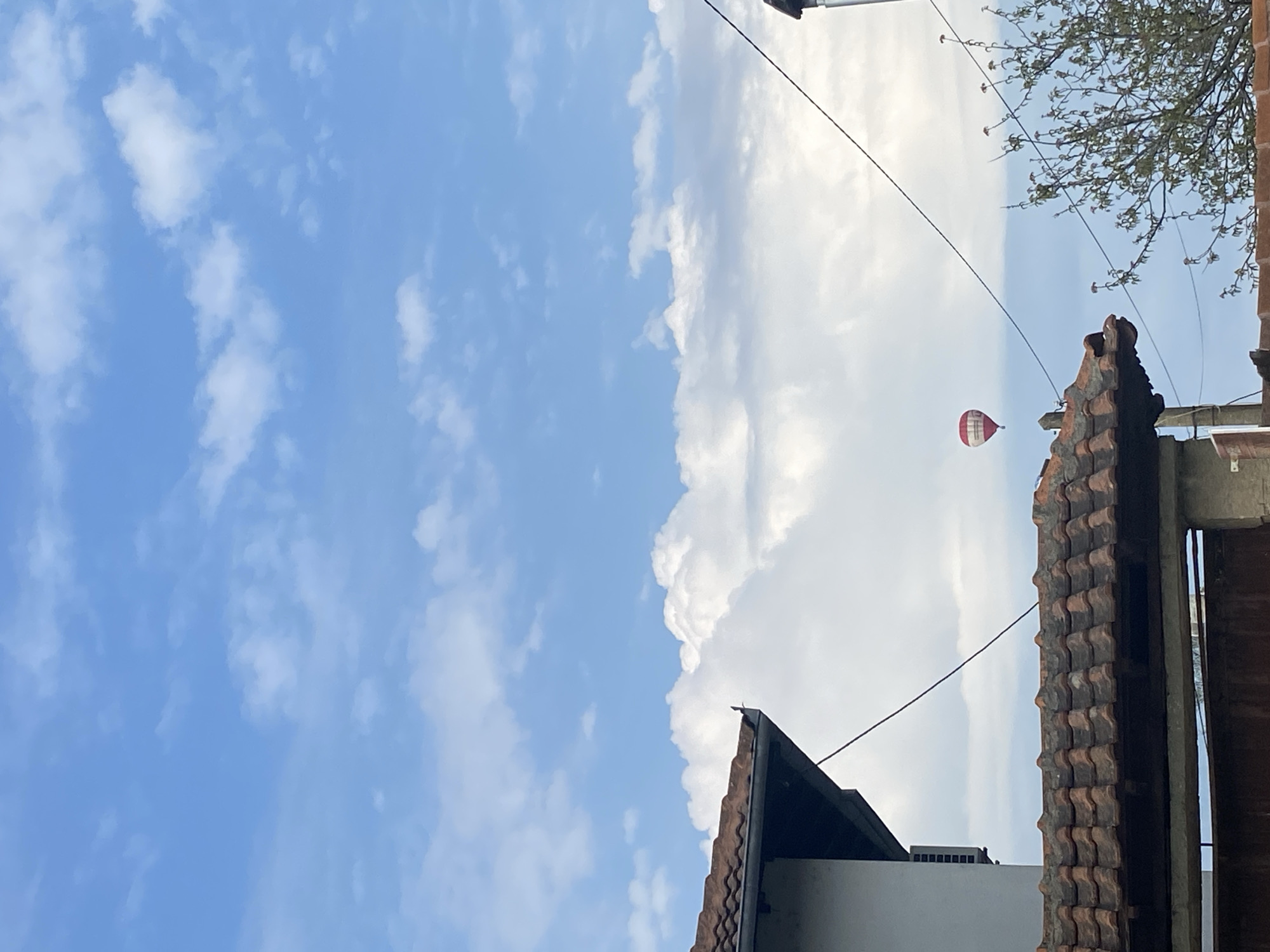 A hot air balloon floats in the sky above Arbanassi, Bulgaria, on a partially cloudy day. The balloon is red and white striped. The viewpoint is from the ground, looking up, with portions of a roof and power lines visible in the foreground, and a branch of a tree is on the top right.