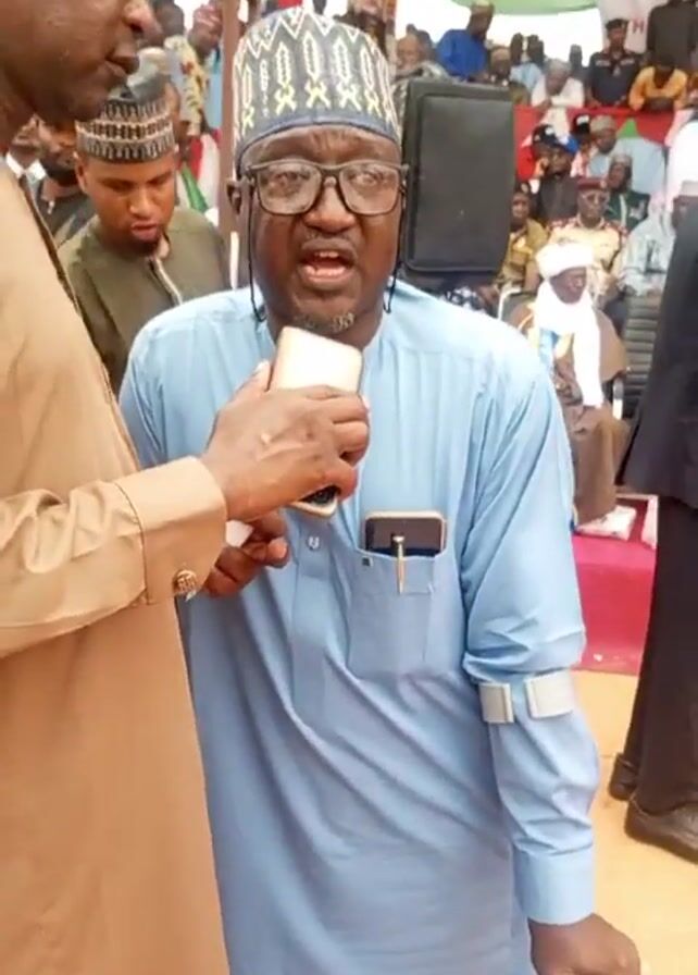 Here is a detailed description of the video: **Setting:** The video appears to be set at an outdoor event. There's a crowd of people visible in the background, with a stage or platform draped in the colors of the Nigerian flag (green, white, green) further back. The area is covered, possibly by a tent or awning. **People:** * **Man with Crutches:** An individual wearing a blue traditional outfit and a patterned cap is speaking into a cell phone held by another man. He wears glasses and has a support brace on one arm, using crutches for support. * **Man Holding Phone:** A man in a brown traditional robe is holding a cell phone up to the speaker's mouth, apparently to record him. * **Background People:** Various individuals are visible in the background, dressed in traditional and casual attire. Some are sitting, others standing. **Objects:** * **Cell Phone:** One person holds a cell phone up to the speaker's mouth. * **Crutches:** The speaker is using crutches. * **Microphone (Possible):** There is a small object clipped to the speaker's pocket, which could be a microphone. * **Speaker:** There is a large speaker behind and to the right of the speaker. **Actions:** * One man is speaking into the phone. * Another man holds the phone to his mouth, presumably recording him. * People in the background are observing or participating in the event. **Interactions:** * The primary interaction is the recording of the man with crutches. **Environment:** * The environment appears to be a crowded public event, likely political or cultural in nature. The presence of the Nigerian flag and traditional attire suggests the event has a Nigerian theme or connection.