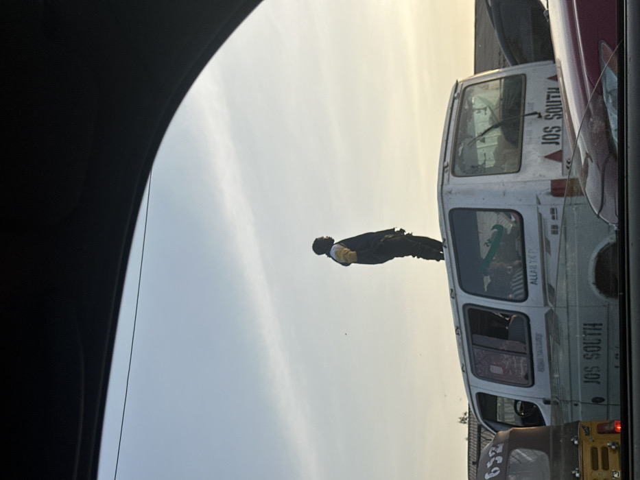 A man stands atop a white van with "JOS SOUTH" written on it, seemingly in traffic. The person, dressed in dark clothing with a yellow accent, balances on the vehicle's roof. The surrounding environment suggests an urban setting with other cars nearby. The photo is taken from inside a car, framing the scene through the windshield.