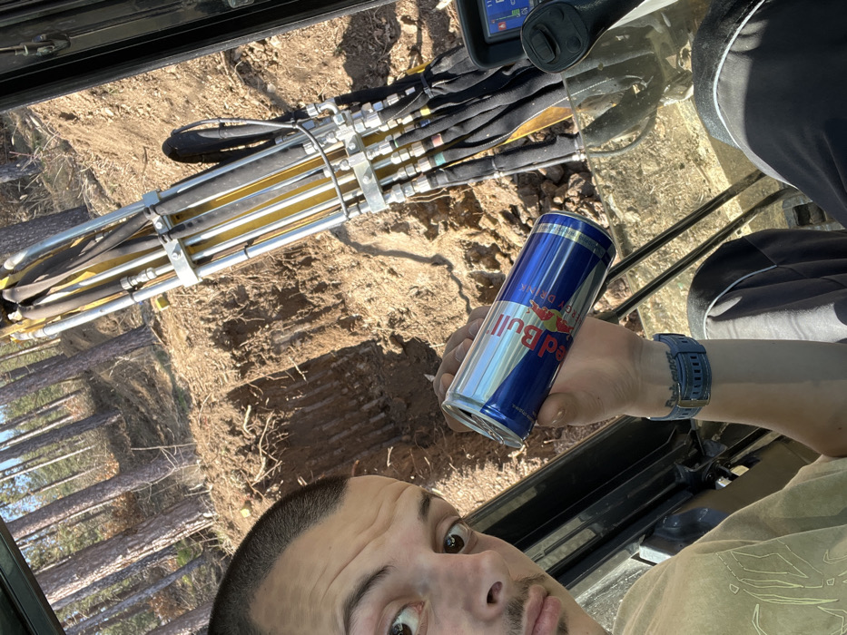 A male individual is observed from chest-up, positioned inside the cabin of heavy machinery, likely an excavator, in Dolni Pasarel, Bulgaria. He has a short buzz cut, light brown eyes, and a thin mustache connected to a small goatee, looking directly at the camera. His right hand holds an open, partially consumed blue and silver Red Bull energy drink can. A blue silicone wristband with legible text reading "Fuck cancer" is visible on his left wrist. He wears a light-colored short-sleeved t-shirt and dark pants with a white stripe on the left leg. Outside the cabin, visible through the windshield, is an excavated trench in dry, light brown soil. Beyond the trench, a dense forest of tall pine trees stands under a clear, bright sky. Part of the machinery's hydraulic arm, consisting of yellow metal, silver pipes, and black hoses, is visible in the upper right quadrant of the image. A control panel and joystick are partially visible on the right side of the cabin interior.