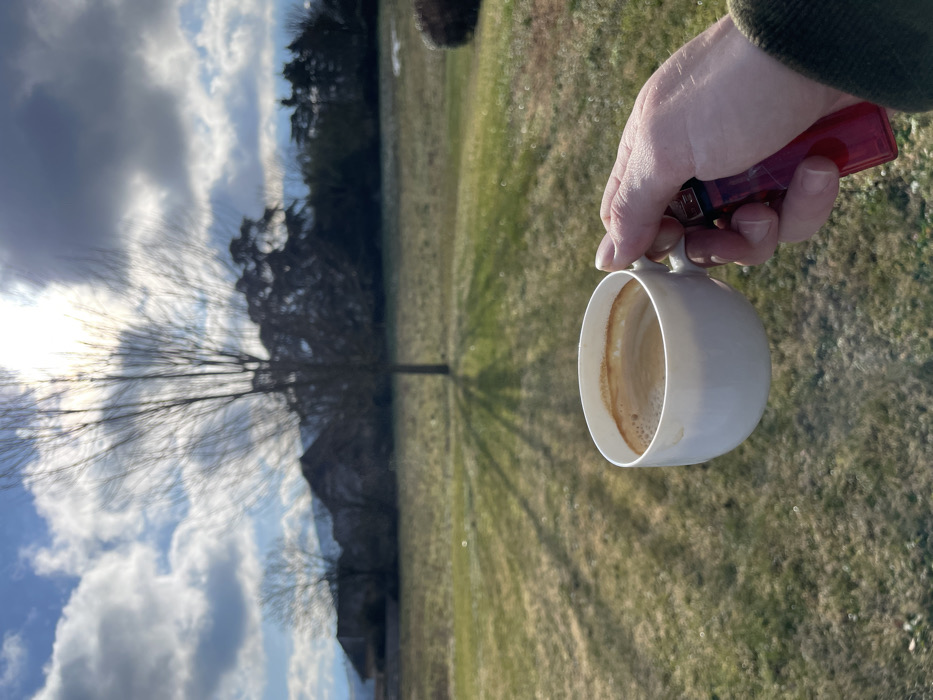 The scene is an outdoor landscape located in Chambéry, France. In the lower right foreground, a person's right hand, clad in a dark green sleeve, holds a white ceramic cup filled with a coffee-like beverage exhibiting crema, concurrently gripping a translucent red cigarette lighter. The midground features an extensive, uneven grassy field, predominantly green with some lighter, drier patches. A leafless deciduous tree stands centrally in the field, casting elongated shadows towards the viewer. In the background, a line of structures, resembling buildings with dark roofs, is visible through sparse trees. Beyond these structures, distant mountains rise under a partly cloudy sky. The sun is positioned high in the upper center of the frame, partially obscured by clouds, generating a visible glare. Scattered patches of snow are discernible on the right side of the field in the midground.