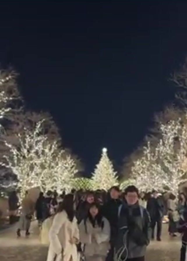 crowd of people gathered in a public square at night to view a large Christmas tree. The tree, located at the end of a brick path, is brightly lit with white lights and topped with a star. Trees on either side of the path are also adorned with lights, creating a festive atmosphere. The people in the crowd are diverse in age and attire, some are smiling and taking pictures. The sky is dark, and there are a few visible lights.