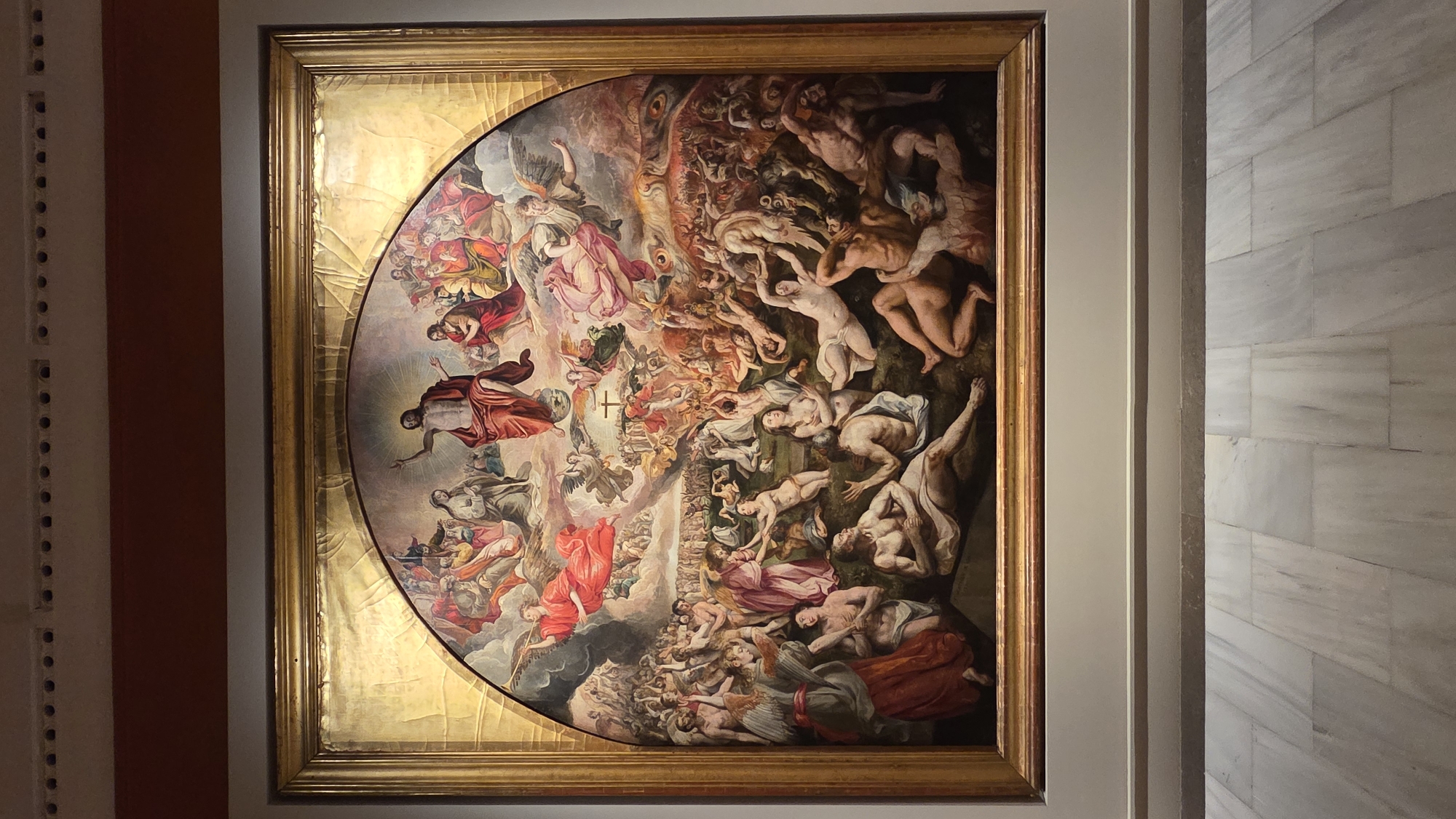 A large, arched oil painting titled "The Last Judgment" by Joaquín Antonio de la Concha is displayed vertically in a gallery within the Museum of Fine Arts of Seville, Spain. The artwork is housed in an ornate, gilded frame. The painting depicts a multi-tiered scene of the Last Judgment. In the upper central section, Christ, cloaked in red, stands with arms outstretched amidst a radiant halo of light and clouds, flanked by saints, apostles, and the Virgin Mary. Angels with trumpets are visible in the middle ground, heralding the event. Below the heavenly realm, a multitude of figures represents the resurrected. On the left side, souls, some clothed and some nude, are shown ascending, guided by benevolent angels towards heaven, exhibiting expressions of hope and relief. On the right side, nude, contorted figures are depicted falling into a fiery, chaotic abyss, tormented by demonic entities, signifying the damnation of souls. The color palette transitions from bright, ethereal tones in the upper section to darker, more dramatic hues in the lower regions, emphasizing the contrast between salvation and damnation. The painting is mounted on a light gray wall. Below the artwork, a light-colored baseboard separates the wall from the floor. The floor is composed of large, rectangular marble tiles exhibiting subtle gray and white veining. Above the painting, a dark reddish-brown horizontal band is visible, featuring a row of small, circular ventilation openings.