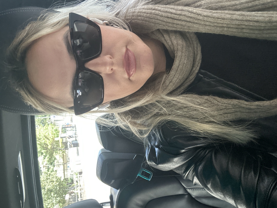 woman sitting in the front passenger seat of a car. She is wearing a black leather jacket, a light brown knitted scarf, black sunglasses, and black and white wireless earphones in her ears. Her blonde hair is long and flowing. The car is in a parking lot in Liverpool, United Kingdom, near the coordinates 53.405, -2.978. The image is a selfie, taken from the woman's perspective. The view outside the car is blurry and shows trees, a street, and buildings. The woman is looking directly at the camera, with her lips slightly parted. She has a neutral expression on her face.