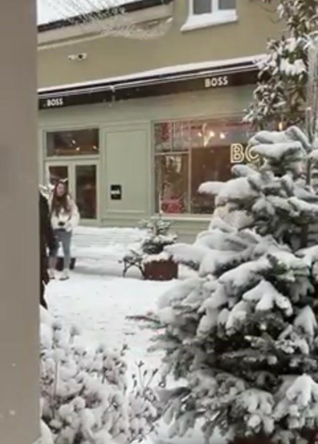 A person walks by a snow-covered outdoor shopping area near a BOSS store. The person, dressed in a dark coat, walks towards the camera carrying a yellow JD Sports shopping bag. Snow is falling and there are other people walking in the background, some wearing light-colored clothing. Small evergreen trees and bushes are covered in snow. The scene appears to be viewed through a window.