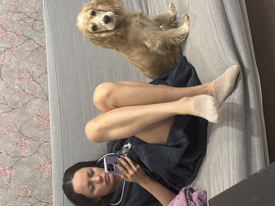 A woman with dark hair and fair skin lies on a gray bed, wearing a blue robe and beige socks. She looks at a purple phone in her hand. A golden cocker spaniel dog sits beside her, facing the camera with a sweet expression. The background features a gray wall with a delicate pink floral pattern. A portion of a dark surface is visible in the lower right corner.