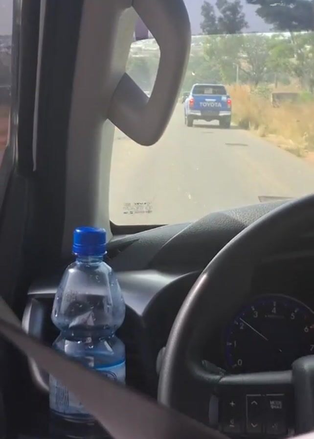 The video is taken from inside a moving vehicle. The camera is focused on the dashboard, specifically a water bottle, the steering wheel, and the road ahead. The road has a line of cars ahead, including a blue Toyota pickup truck. A hand momentarily obscures the camera's view. The sky is visible and appears clear. The environment outside the vehicle consists of trees and dry land.