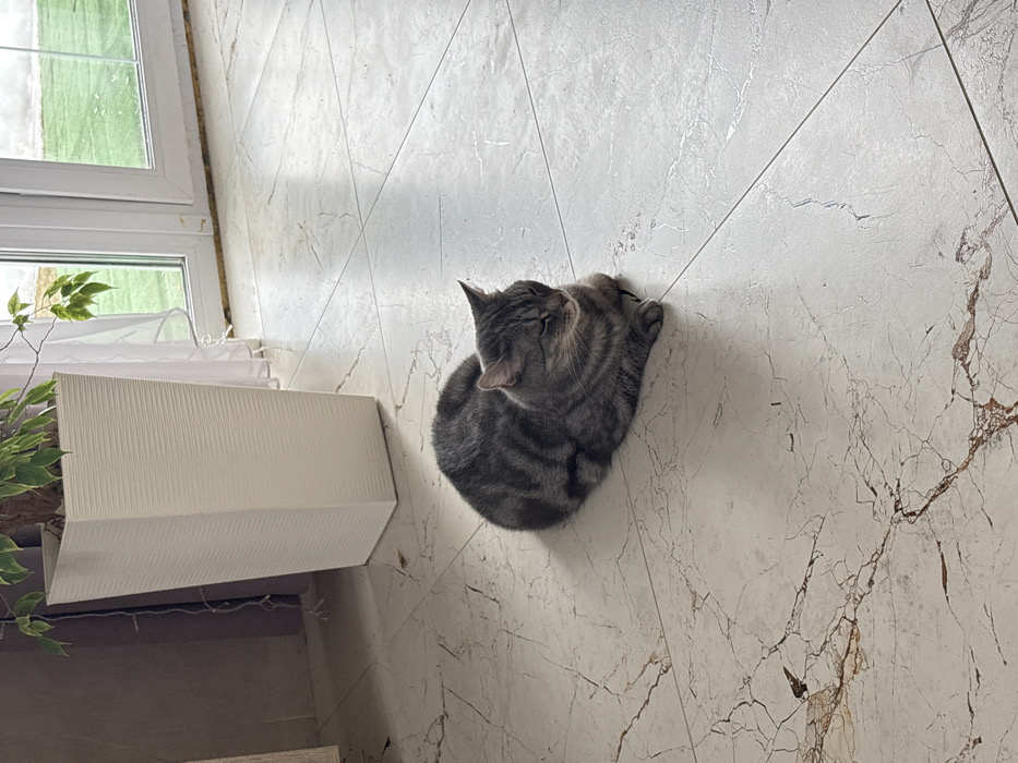 - "An indoor scene in Нестюково, Russia, depicts a gray tabby cat resting on a light-colored, veined tile floor" by FM-xlahD2, licensed under CC BY 4.0