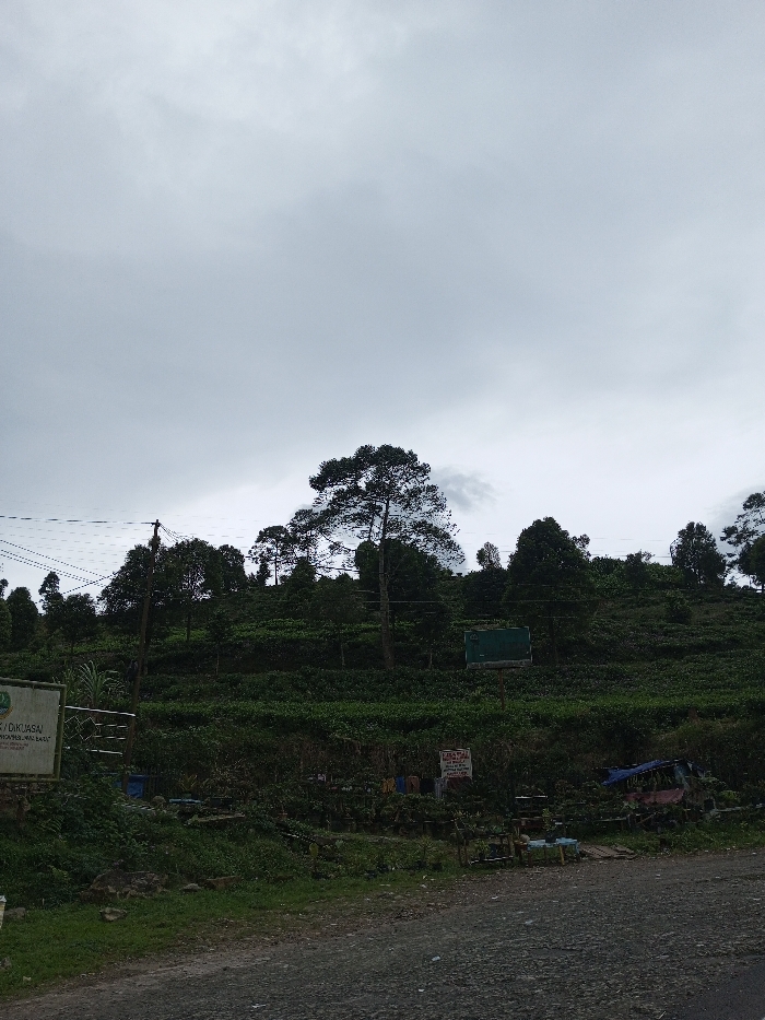 The image captures an overcast daytime scene in Adhanur, India, depicting a sloping landscape adjacent to a roadway. The foreground features a dark, coarse gravel road bordered by a grassy verge on the left. Ascending from the verge is a densely vegetated hillside, dominated by numerous evergreen trees of varying heights, some silhouetted against the uniformly grey, cloudy sky. The lower slopes of the hillside exhibit rows of cultivated green foliage, consistent with a plantation. In the midground, situated along the roadside at the base of the hill, are several small, informal stalls. These stalls display potted plants and other merchandise, including a pile partially covered by a blue tarp on the right. Two rectangular signs are visible: one partially obscured white sign with dark text on the far left, and another, smaller white sign with red text on the right. A utility pole with multiple overhead power lines extends upwards from the left into the hillside vegetation. A green rectangular billboard is visible higher on the hillside, amidst the trees. No individuals are present in the scene.
