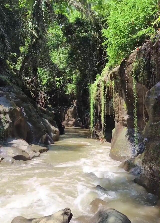 river flowing between rocky banks covered in lush greenery. The water is murky brown and turbulent, rushing over large rocks. The camera is positioned low, near the water level, giving a close-up view of the rapids and the surrounding vegetation. The banks are steep and covered with plants, including hanging vines. The lighting is bright, highlighting the details of the foliage and the water's movement. No people or animals are visible in the video.