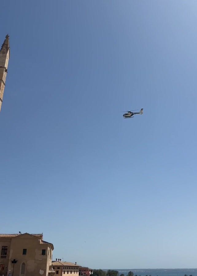 helicopter flying over a large cathedral in Palma de Mallorca, Spain. The camera starts with a view of the sky and the helicopter, then pans down to show the cathedral and the harbor. The cathedral is a large Gothic building with tall spires and ornate carvings. There are people walking around in the foreground, looking at the cathedral. The harbor is visible in the background, with boats and palm trees. The sky is blue and clear, and the sun is shining.