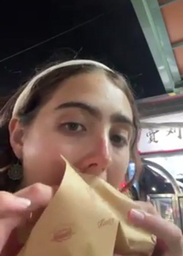 A woman, from the chest up, eats something wrapped in brown paper. She is holding the paper in both hands, opening it slightly. She is fair-skinned with light brown hair pulled back with a white headband. She has large brown eyes. She bites down into the food. The background is dark, it appears to be night. There are signs in another language behind her, with red and white lights. Part of a green corrugated roof is visible above her. She is wearing a light blue top. Her left ear has a round patterned earring.