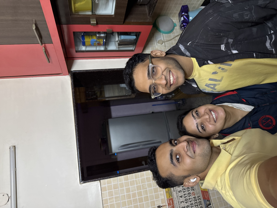 Three individuals, two males and one female, are depicted in a selfie captured indoors, within a residential kitchen or adjacent area in the city of Kolkata, India