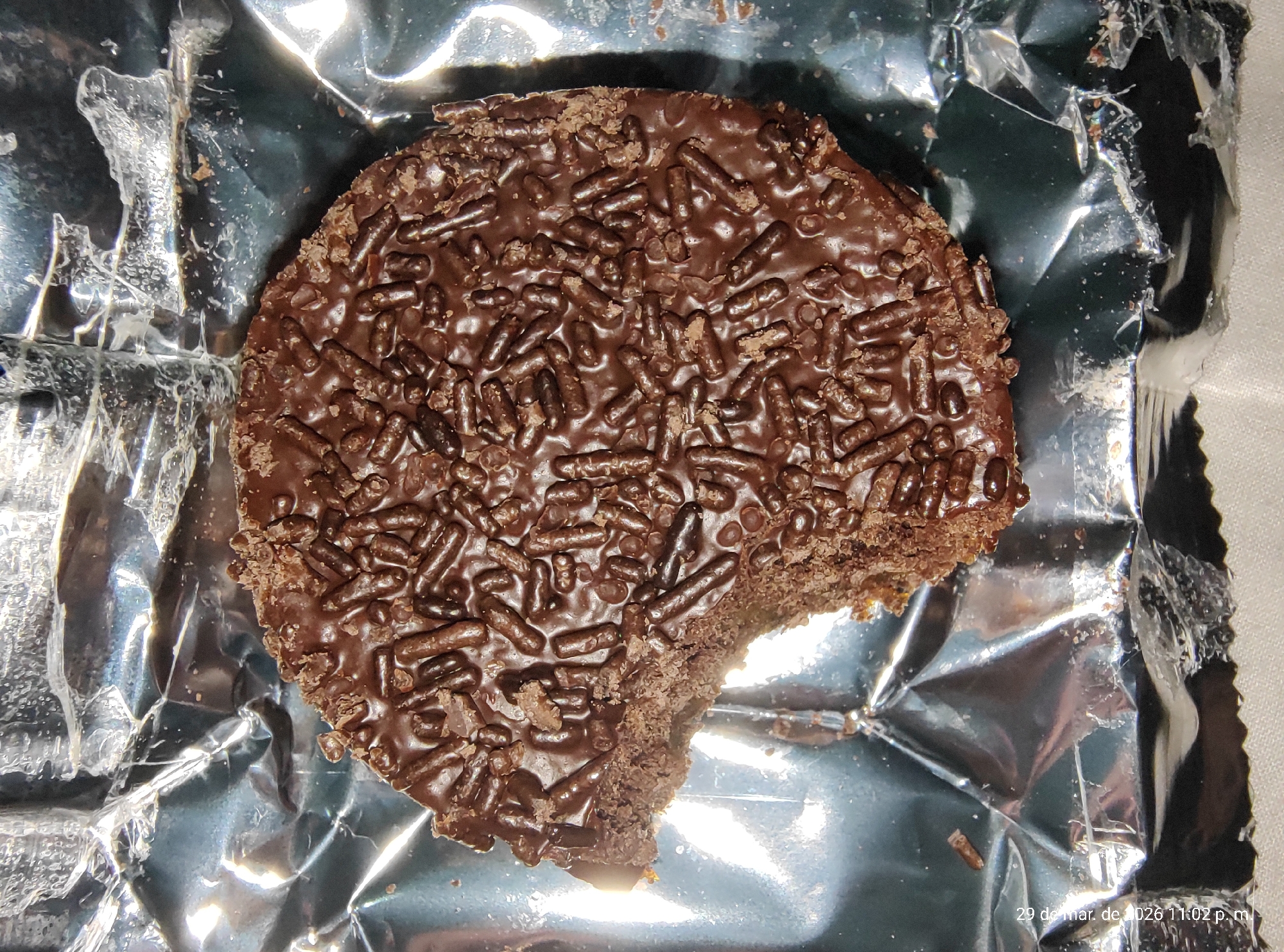 A partially consumed alfajor maicena chocolate cookie lies on a crumpled piece of silver foil packaging. The cookie is round and covered in chocolate sprinkles. A bite has been taken out of the cookie, revealing the interior. The scene is likely in Wilde, Argentina, as indicated by the date and time stamp on the image: "29 de mar. de 2026 11:02 p. m."