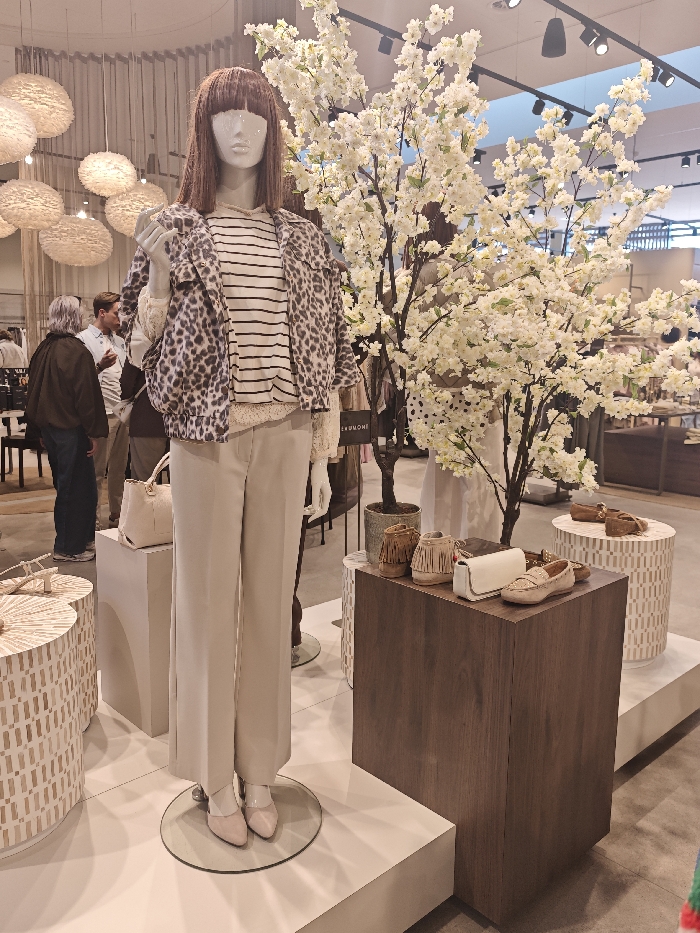 The image depicts an indoor retail environment, identified as a fashion store located in Wierden, Netherlands. The central subject is a female mannequin positioned facing forward on a circular glass base atop a white display platform. The mannequin is dressed in a contemporary outfit: a short-sleeved brown and black leopard-print jacket over a white long-sleeved top with thin black horizontal stripes. She wears light beige wide-leg trousers and light pink pointed-toe flat shoes. Her head features shoulder-length brown hair with bangs and a featureless white face. To the right of the mannequin, a large artificial tree with abundant white blossoms dominates the midground. Below and to the right of the tree, a dark brown rectangular pedestal displays several accessories: a small white structured handbag, a pair of light beige moccasins, and two pairs of brown suede ankle boots featuring fringe details. Adjacent to this, a cylindrical white pedestal with a repeating geometric pattern also holds light-colored footwear. To the left of the mannequin, a light beige rectangular pedestal holds a white handbag. Further left, a circular white pedestal with a textured surface displays a woven basket or similar decorative item. In the blurred background, several individuals are visible. To the far left, a person with gray hair wearing a dark jacket and blue trousers stands with their back partially to the viewer, engaged with another person in a light blue collared shirt. Throughout the background, additional retail displays, clothing racks, and mannequins are discernible. Overhead, a combination of large, textured spherical pendant lights and black track lighting illuminates the space. The flooring is light-colored.