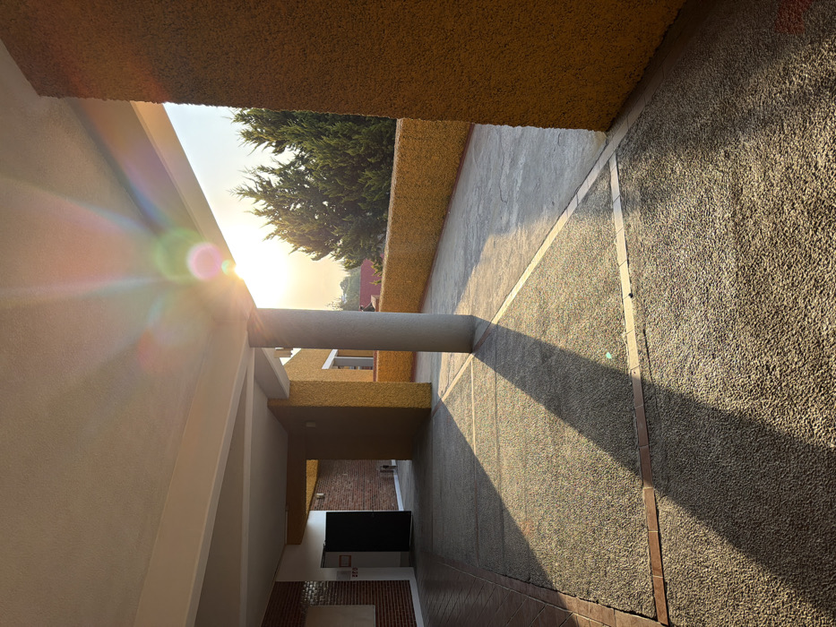 A concrete walkway stretches under a building's overhang, sunlight streaming in from the right