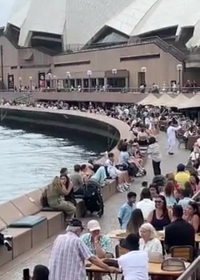 The video showcases a waterfront scene in Sydney, Australia. Initially, the Sydney Opera House is prominently displayed, with crowds of people enjoying the outdoor area. Some are seated at tables, while others stroll along the water's edge. The camera then pans to reveal the cityscape and harbor, culminating in a shot of the Sydney Harbour Bridge. The sky is overcast, and a ferry passes beneath the bridge.