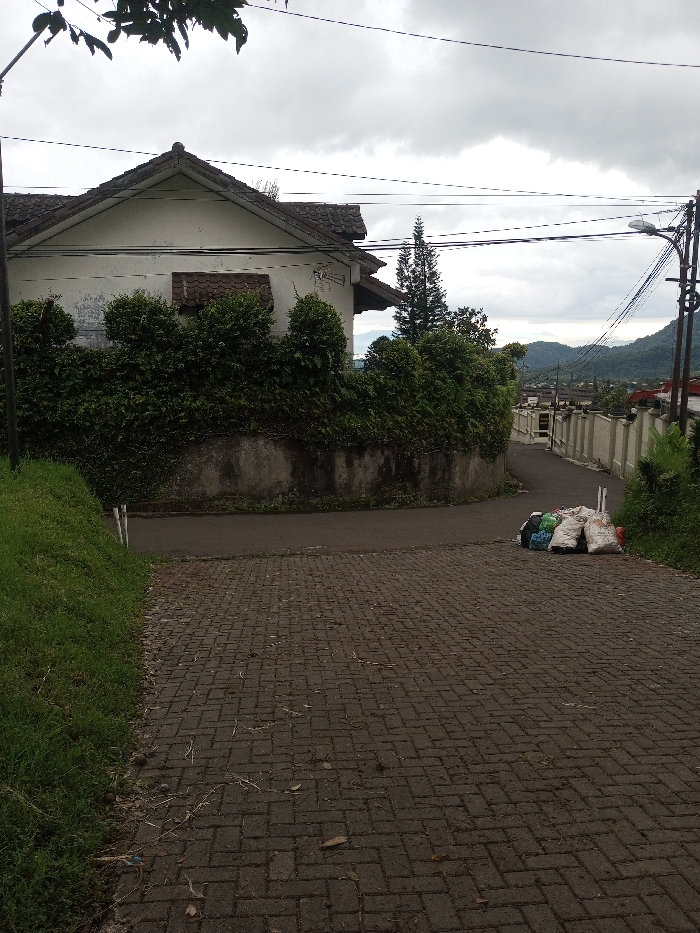 A paved road lined with green grass and foliage leads to a corner with a white house partially obscured by a hedge-covered wall. A pile of bags sits on the roadside. Beyond the corner, a straight road bordered by a white fence recedes into the distance. Mountains are visible in the background beneath a cloudy sky. Power lines crisscross above.
