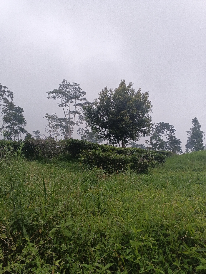 The scene depicts a hazy, natural landscape in Banteay Srei, Cambodia, under an overcast sky. The foreground is dominated by a dense growth of unkempt green grass and various leafy plants. In the midground, a low, continuous line of dark green bushes or small trees stretches horizontally across the frame. Behind this shrubbery, numerous taller trees with varying shades of green foliage extend towards the background, their forms becoming less distinct due to atmospheric haze or fog. The sky above is uniformly light gray, obscuring any clear horizon or features. No people, animals, or man-made objects are present.