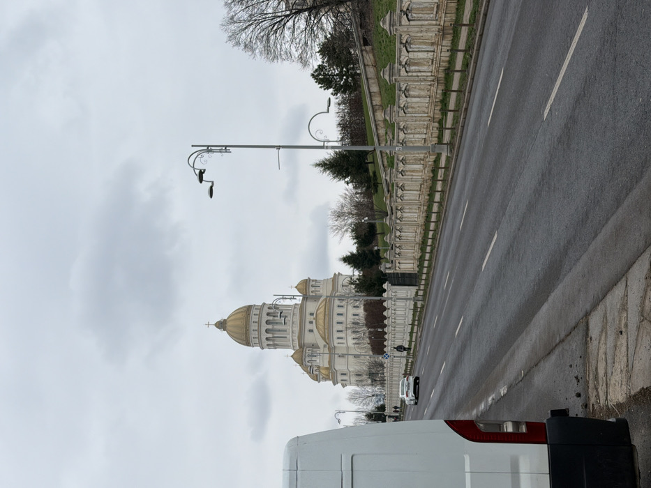 A daytime, wide-angle photograph captures an urban scene in Bucharest, Romania, under an overcast sky. The prominent subject in the background is the National Cathedral (Catedrala Mântuirii Neamului), a large, light-colored, multi-tiered structure featuring several golden domes, the tallest of which is centrally located and topped with a cross. In the immediate foreground, the rear passenger side of a white van is partially visible on the left, obscuring a portion of the scene. The road consists of two asphalt lanes, marked with white dashed lines, and appears damp. It extends diagonally from the lower-left toward the center-right. A sidewalk runs parallel to the road on the right, bordered by a long, weathered, light-colored ornate stone wall comprised of numerous panel segments. Small wooden bollards are positioned along the sidewalk edge. Beyond the wall, an elevated grassy area is visible, containing several bare deciduous trees and some evergreen conifers, suggesting a cooler season. A tall, grey metal streetlamp with three curved arms holding disc-shaped lights stands in the mid-right. Further down the road, a second, shorter streetlamp is visible. In the midground, a white sedan is observed driving away from the camera in the left lane of the road, positioned in front of the cathedral. Multiple human figures are discernible walking on the sidewalk at the base of the cathedral. The sky is uniformly grey and overcast.