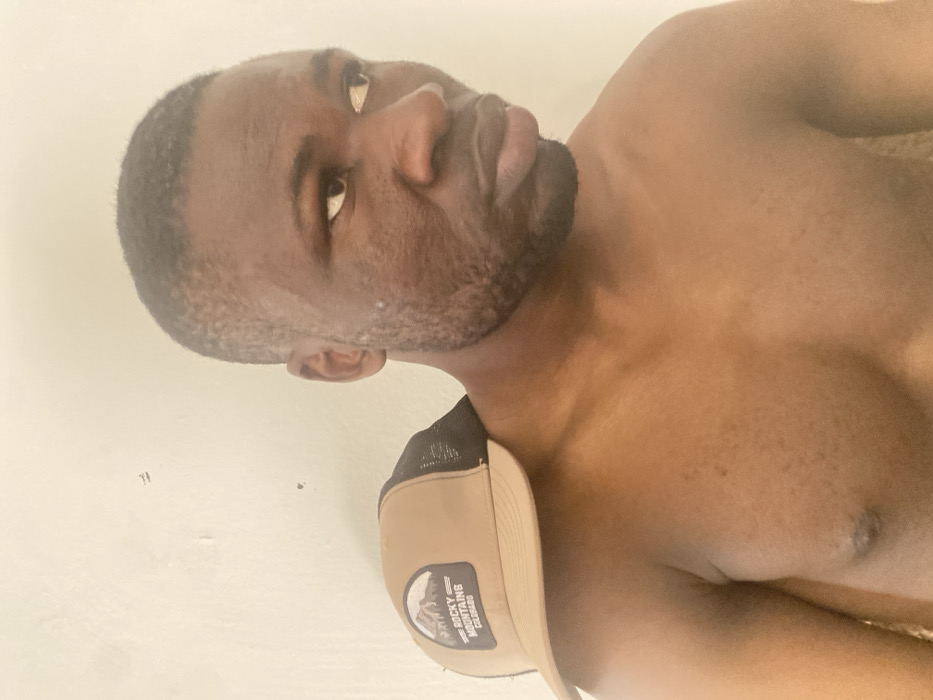 The image presents a close-up, chest-up view of an adult male of dark complexion, reportedly located in Du, Nigeria. The subject is shirtless, revealing his bare chest and shoulders. His head is turned to the right, with his gaze directed off-camera to the right, exhibiting a neutral expression. He has short, dark hair and a short beard or stubble. A tan-colored trucker-style baseball cap, featuring a black mesh back and a front patch depicting a mountain range with the text "ROCKY MOUNTAINS COLORADO," rests on his left shoulder. The background is a plain, light-colored wall displaying minor blemishes and surface irregularities, indicating an indoor setting. The scene is illuminated by soft, diffused lighting.