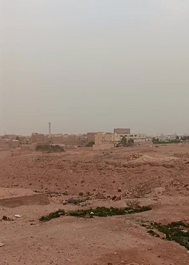 landscape consisting of a dusty, reddish-brown terrain with scattered rocks and sparse vegetation. In the distance, a small town with light-colored buildings is visible. The sky is overcast, contributing to a hazy, muted light. The camera is static, providing a wide, establishing shot of the scene.
