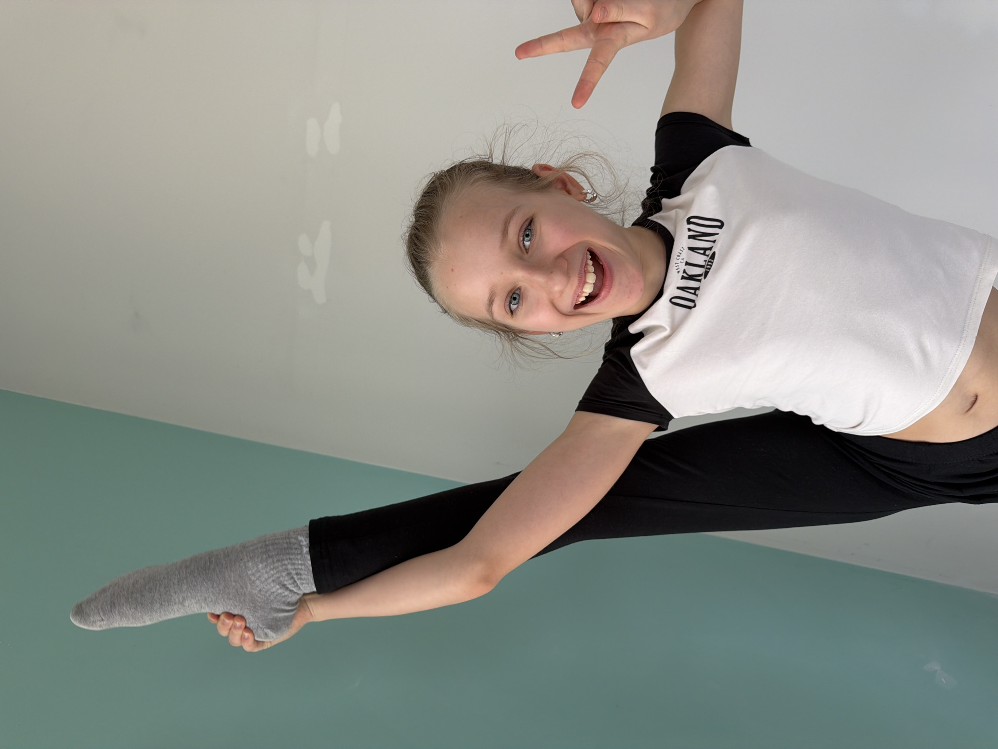 A young girl is performing a split in front of a wall that is white on top and teal on the bottom. She is wearing a white t-shirt with black sleeves and the word "OAKLAND" printed on the front, along with black pants and grey socks. She is smiling and holding up two fingers in a peace sign. The image appears to be taken indoors. The location is Dreiliņi, Latvia.
