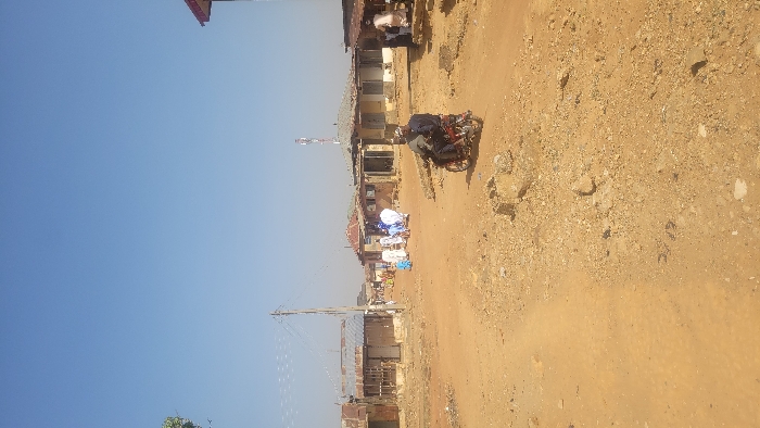 The image depicts a sunlit, unpaved street scene in Badiko, Nigeria