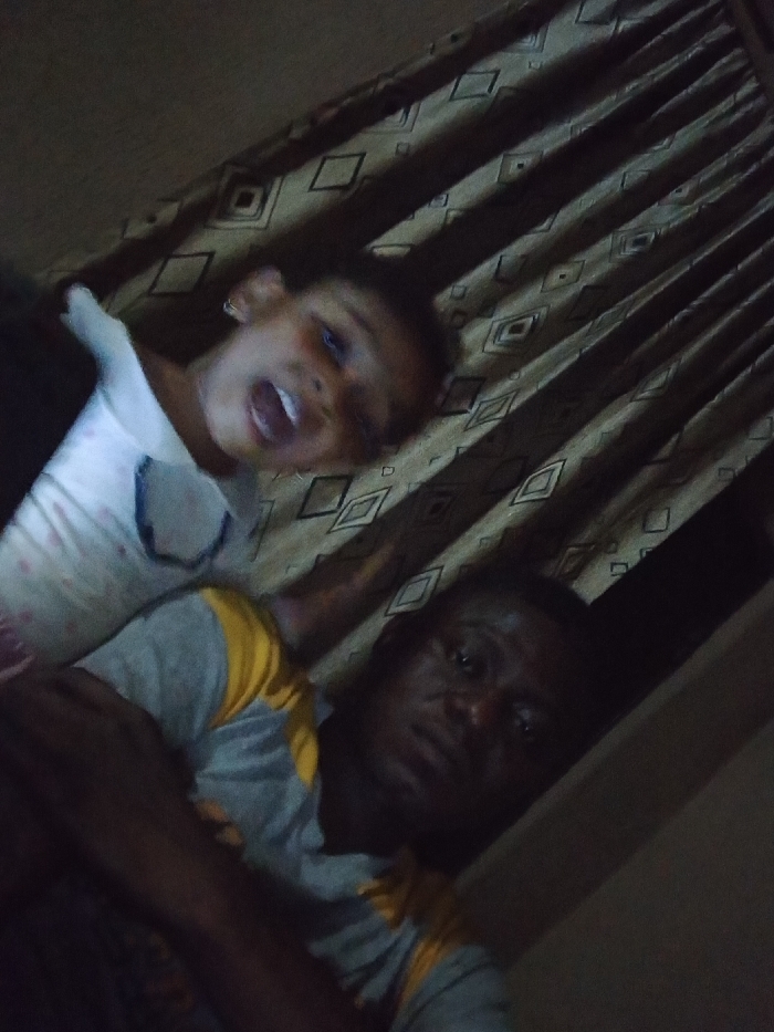 The image depicts two individuals, a young child and an adult male, in a dimly lit indoor setting in Sabon Tasha, Nigeria