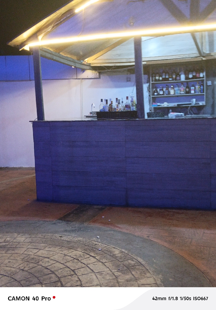 - "An outdoor bar structure is shown with a dark, flat-paneled counter, wooden roof, and support beams" by FM-1TzsI3, licensed under CC BY 4.0