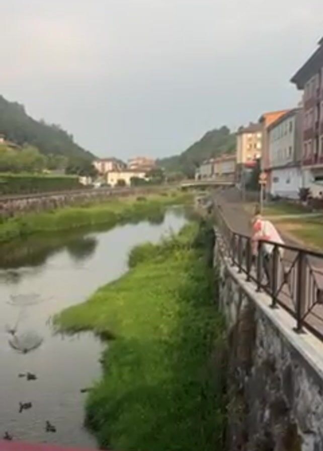 The view from a bridge shows a river running through a small town, lined with vegetation and buildings. Ducks swim in the water. A man stands by a stone wall and railing, looking out at the scene. The sky is overcast.