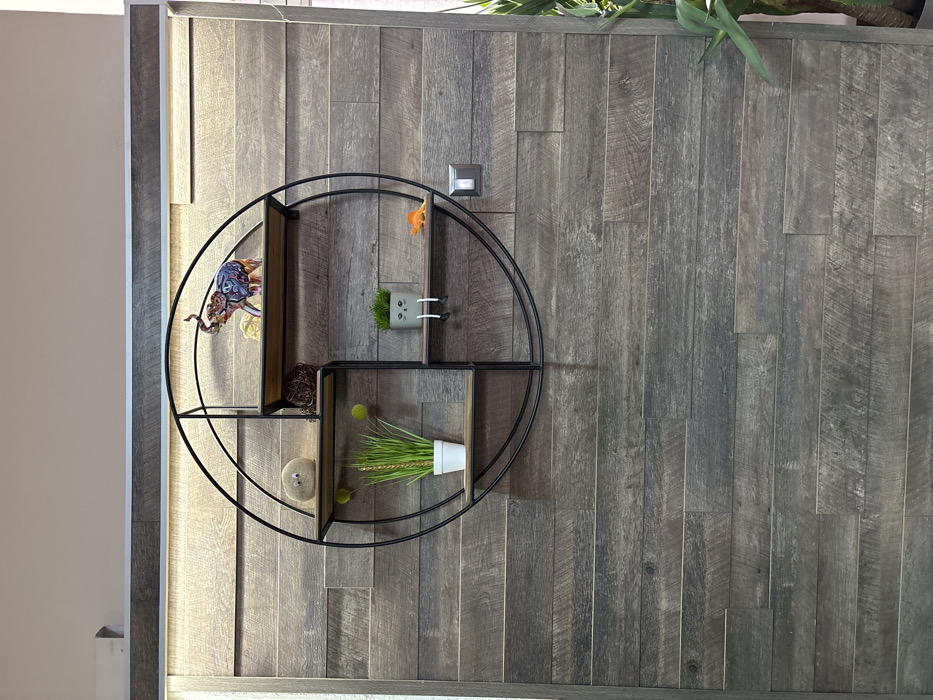 The scene depicts an interior wall in Nova Zagora, Bulgaria, centered on a wall-mounted circular shelf unit. The wall is covered with horizontal, weathered greyish-brown wooden planks of varying tones and textures, arranged in a staggered pattern. Above these planks, a horizontal metallic grey trim with integrated LED lighting runs across, illuminating the wooden surface below. The wall area above the trim is plain light off-white. The circular shelf unit is constructed from black metal framing and contains three internal wooden shelves. On the uppermost shelf, a multi-colored decorative elephant figurine, exhibiting various patterns and hues, stands in front of a light-colored, possibly woven, spherical object. The middle-left section of the unit features a smooth, light-colored, oval-shaped rock with two googly eyes attached to it. Below this, on a lower shelf, a dark brown woven sphere is placed. On the bottom-left shelf, a white cylindrical pot holds artificial green grass foliage, accented with three chartreuse-colored spherical decorations. On the middle-right shelf, a small grey pot containing artificial green grass has a cartoonish face drawn on it and two white "legs" with black "feet" dangling over the shelf edge. Adjacent to this pot, an orange plastic toy dinosaur is positioned. To the right of the circular shelf unit, a rectangular dark grey electrical light switch is mounted on the wooden plank wall. A portion of a tall green plant with broad leaves is visible along the far right edge of the frame. No individuals are present, and no active interactions are depicted within the static arrangement of objects.