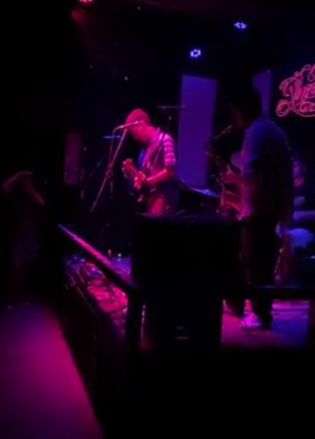 A band performs on a small stage in a dimly lit club. A guitarist in a patterned shirt stands near the microphone, focusing on their instrument. To their right, a saxophone player is partially visible, also playing. In the background, a drummer keeps the beat. The stage is illuminated with pink and purple lights, and there's a keyboard in the foreground. The band's logo is displayed on the back wall.