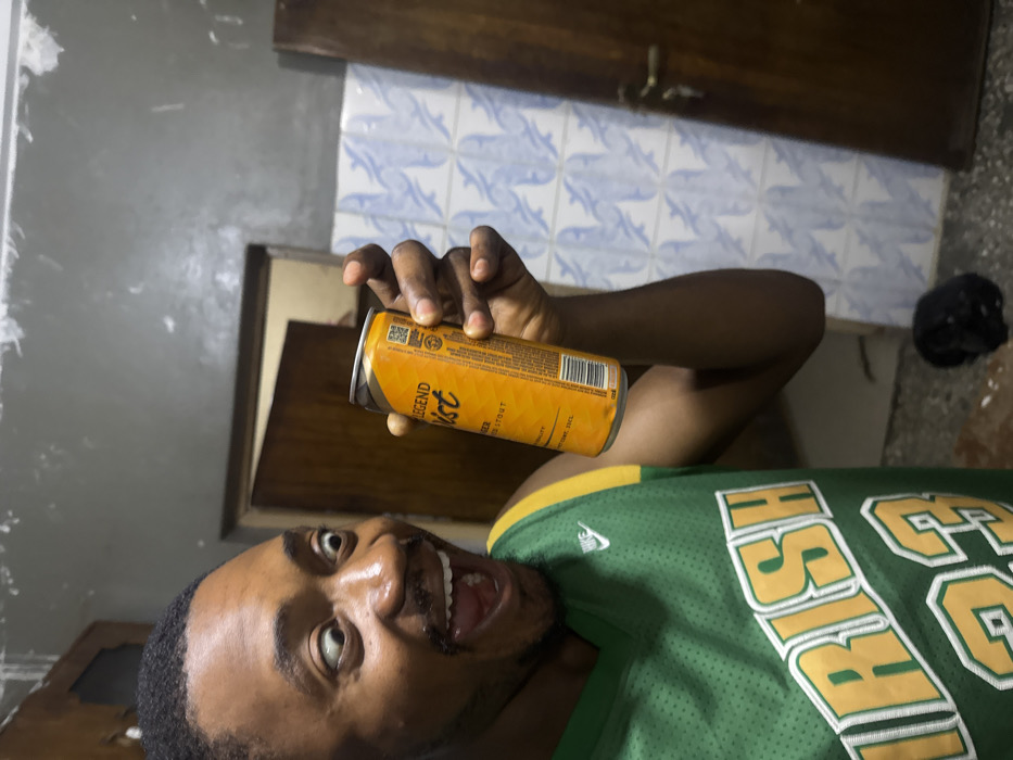 A Black man in an "Irish" jersey excitedly holds up a can of "Legend Twist" stout. He faces the camera with a wide grin. The background shows a mottled gray wall, blue and white patterned tiles, and a dark wood panel. A dark object rests on the floor, partially obscured. The photo appears to be taken indoors, with the man lying down or positioned at an unusual angle.