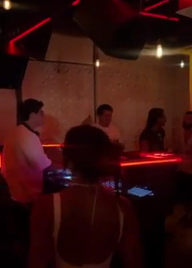 person dancing in a dimly lit nightclub. There is a DJ booth with at least two people behind it. One of the people is DJing and the other is waving his hand and talking. There are other people standing around the DJ booth. There is red lighting on the ceiling.