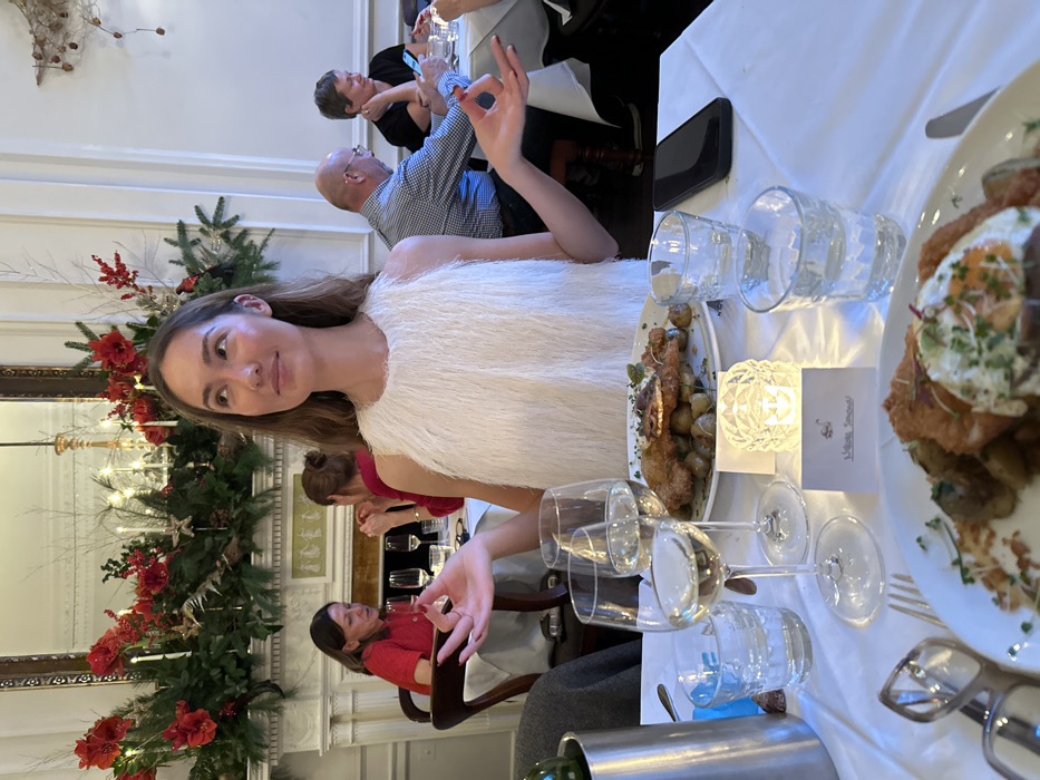 A woman in a white dress sits at a formally set table with wine glasses, water glasses, and plates of food. A lit candle illuminates a name card. Behind her, others are seated at the table. Christmas decorations adorn the wall. The woman looks at the camera with an "okay" hand gesture.